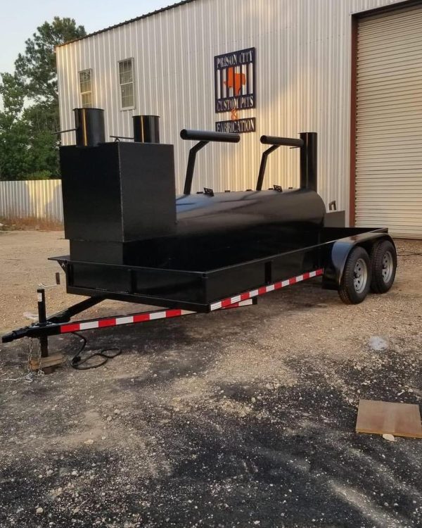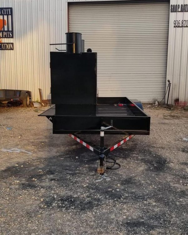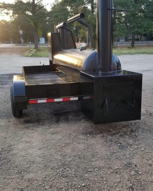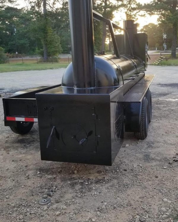 This massive pit is made out of a long 500 gallon propane tank with a massive fully insulated 32×32 firebox and a 30x32x36 smoker. This unit has 4 huge racks in the cooking chamber and a total of 5 racks in the smoker. Whether you want to cook conventional or reverse flow it can be done by adding or removing the tuning plates and closing the necessary stack. All this sitting on top of a tandem braking axle 6×14 trailer.