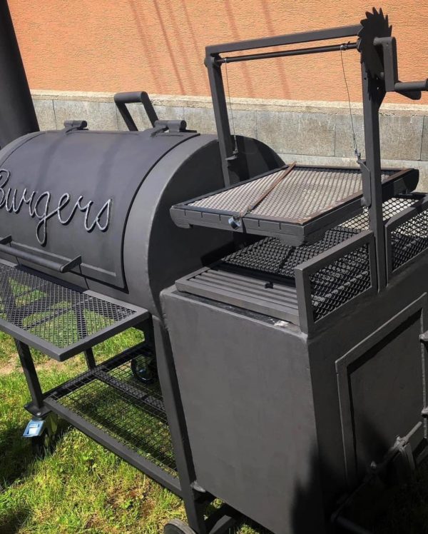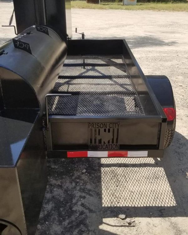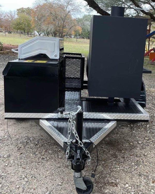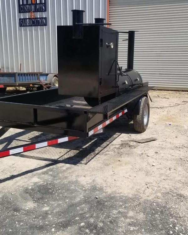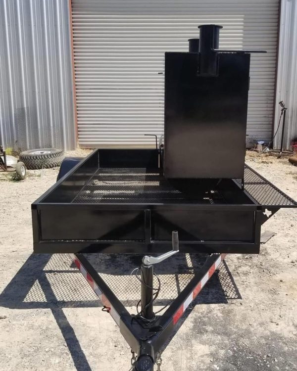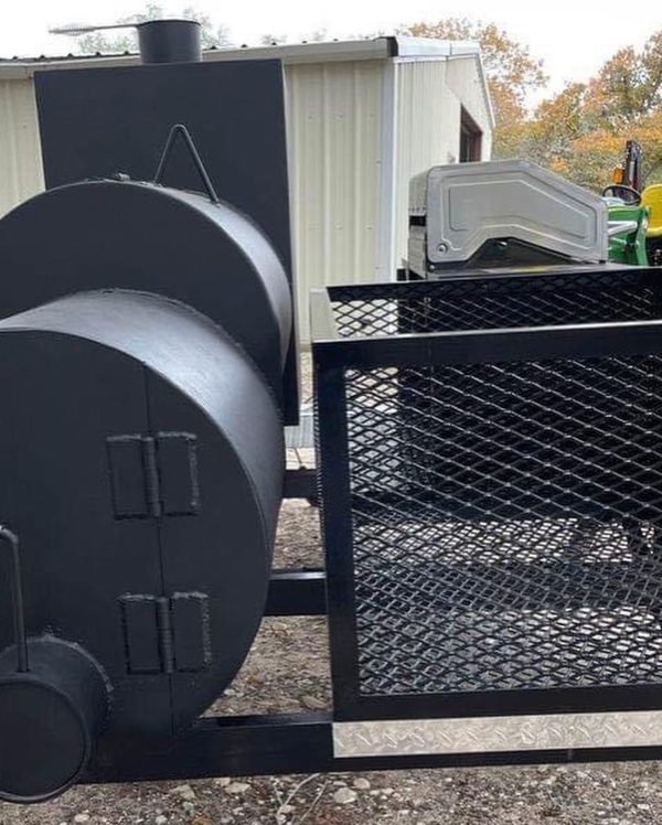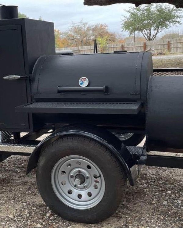 New barbecue pit for sale with smoker all custom built trailer 5×8 long the firebox is 3/8 thick 24inches in diameter by 2 feet long. Main chamber is quarter inch thick 24 x 5feet long smoker is 3/16 thick 24 inches wide 3 feet high by 24 inches deep. Also has a gas grill with four burners. The wood box is 32 inches wide 44 inches long and 20 inches deep.